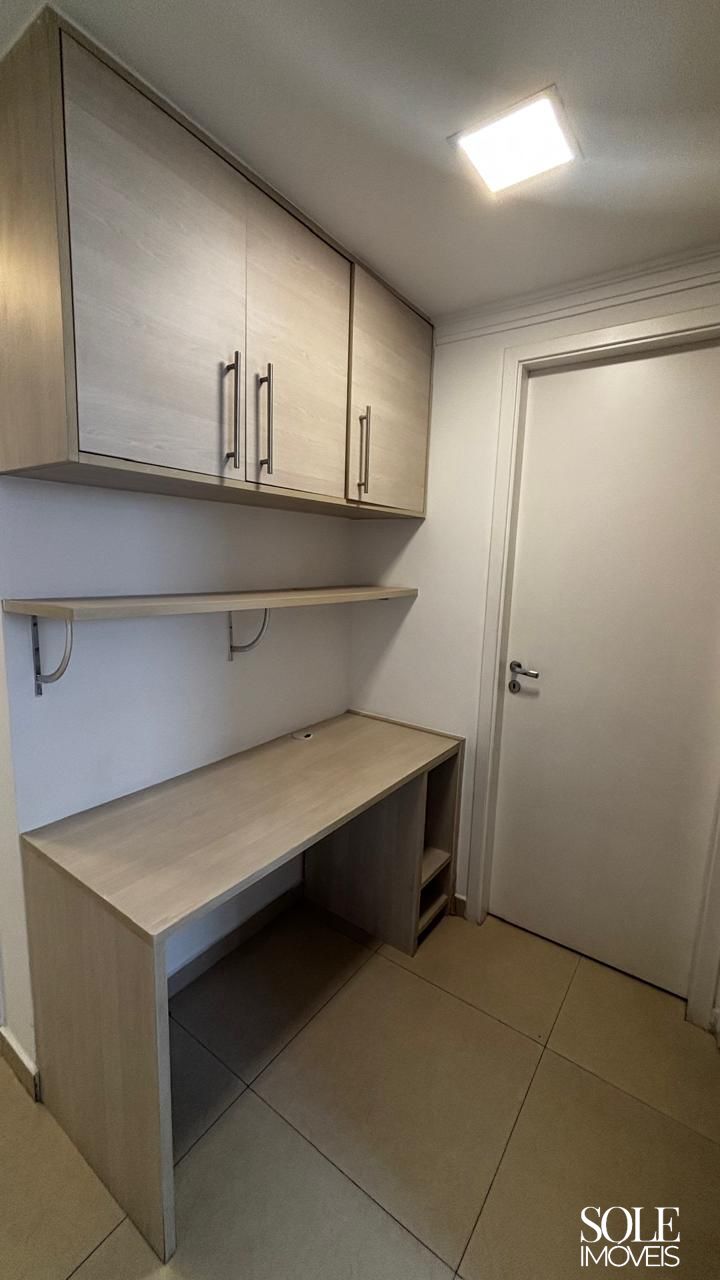 O apartamento possui armários planejados nos dormitórios, banheiros, cozinha, lavanderia e sacada. A sala dispõe de rack para TV e há um ambiente de escritório planejado, ideal para home office. A cozinha é equipada com cooktop e exaustor, além de gás encanado. Ventiladores de teto atendem a sala e os dormitórios, reforçando o conforto térmico.