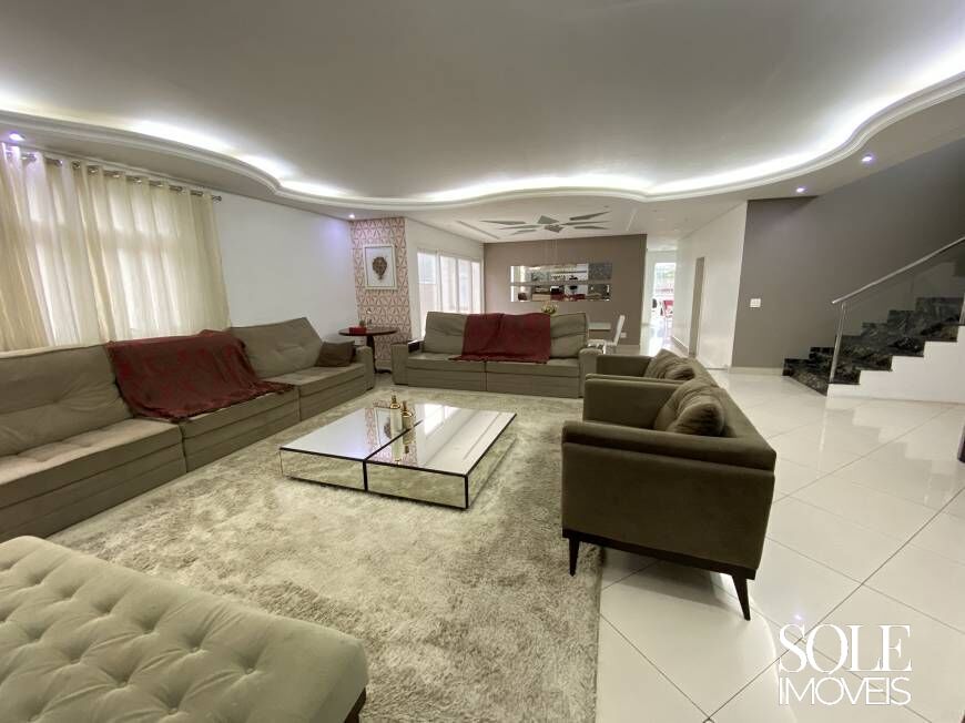 A sala é ampla, arejada e em conceito aberto, conectada à cozinha espaçosa com armários planejados. A área de convivência principal está concentrada no térreo, enquanto os dormitórios ficam no piso superior. No piso inferior, piscina e área gourmet coberta com churrasqueira ampliam as opções de lazer. A casa possui corredores laterais em ambos os lados e vista privilegiada para a Serra do Japi.