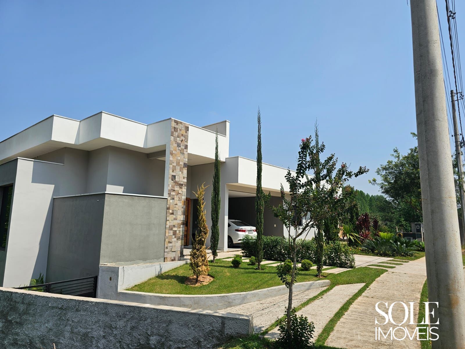 Na parte inferior, a área de lazer dispõe de piscina, cozinha de apoio, banheiro e um salão amplo para confraternizações e jogos, criando um ambiente completo para momentos especiais. A fachada com jardim, o paisagismo lateral e as 2 vagas de garagem cobertas reforçam o cuidado nos detalhes.