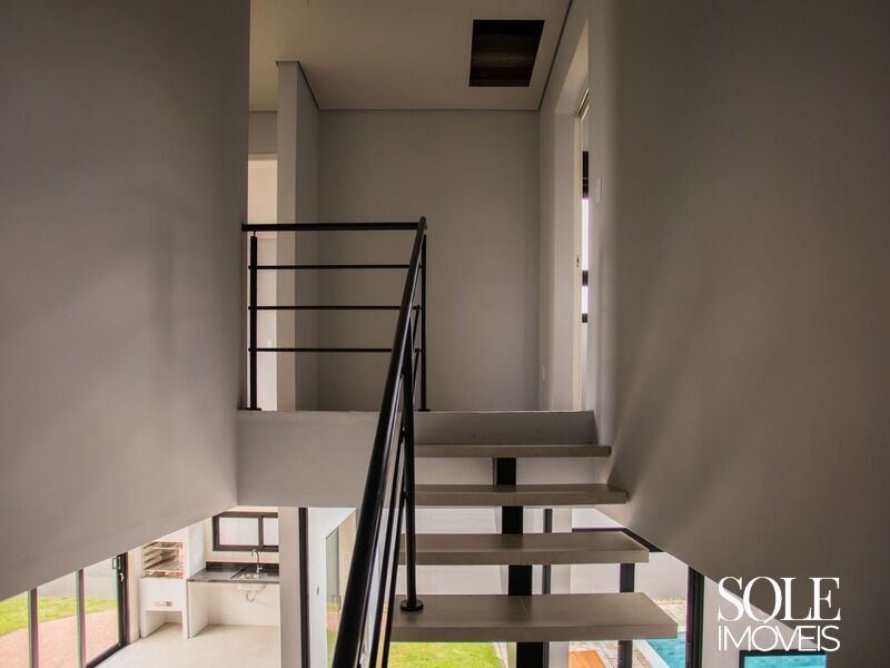Internamente, a casa apresenta acabamentos de alto padrão, com piso em porcelanato, bancadas em pedra preto São Gabriel na cozinha e na churrasqueira, além de esquadrias personalizadas em toda a residência, com automação nos dormitórios.