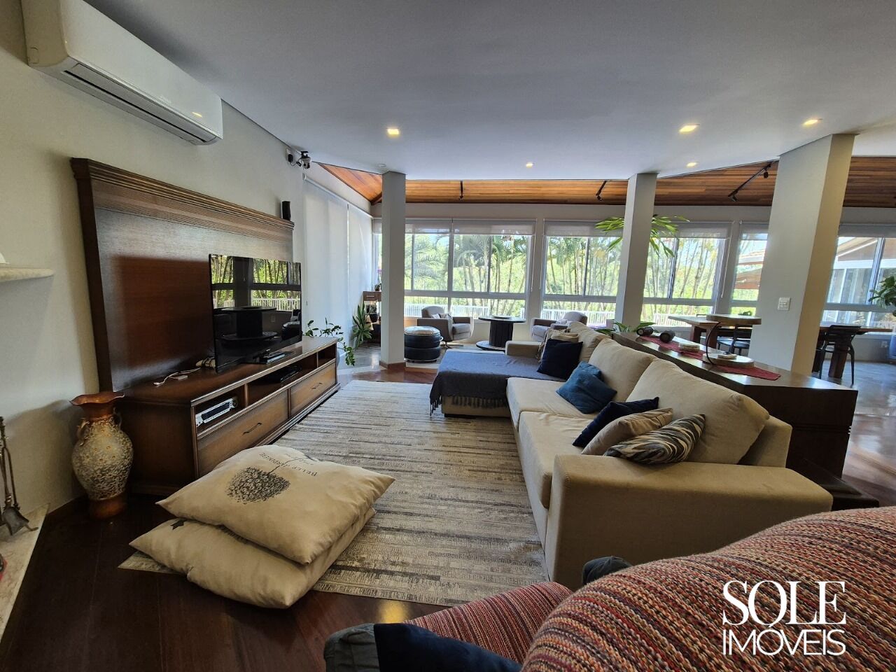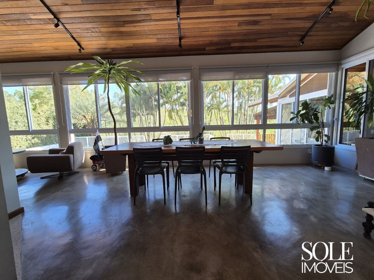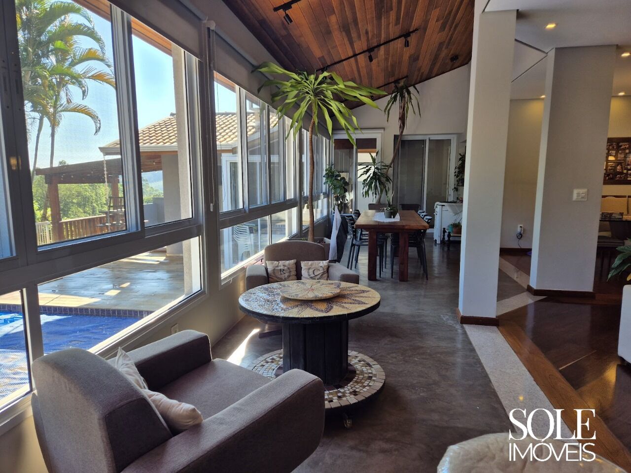 Casa de alto padrão em condomínio fechado. A área social reúne três ambientes em perfeita harmonia — sala de jantar, TV com lareira e varanda —, conectados por amplas janelas de vidro com vista para o pôr do sol e o verde do entorno. A varanda interna, com piso em cimento queimado e teto em madeira, reforça o estilo contemporâneo e acolhedor.